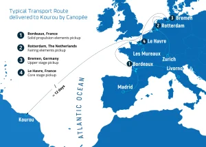 Avant sa traversée de l’Atlantique, Canopée effectue une série d’escales à proximité des grands sites industriels d’ArianeGroup en Europe afin d’embarquer les différents éléments du lanceur Ariane 6. En tant que maître d’œuvre industriel du programme, ArianeGroup assure la conception, le développement, la production et l’intégration du lanceur.