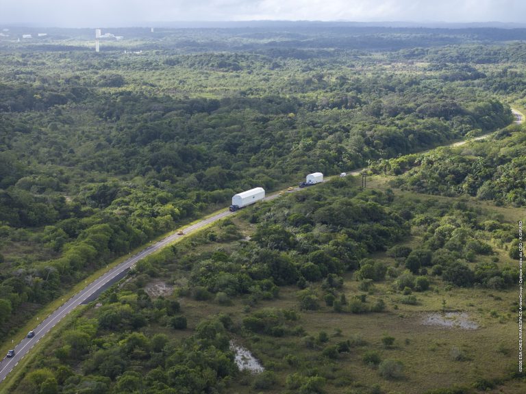 Les étages de la première Ariane 64 sont arrivés en Guyane française, à l’issue de leur traversée transatlantique à bord de Canopée, le navire hybride à voiles chargé de transporter les étages d’Ariane 6 depuis l’Europe continentale jusqu’à Kourou.