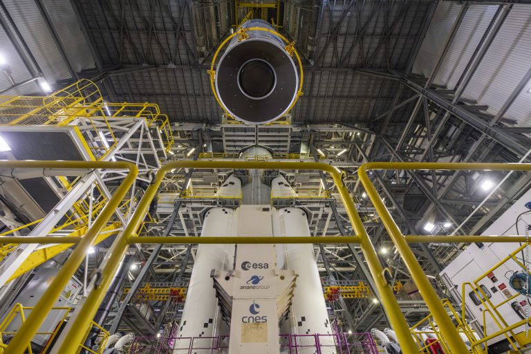 Encapsulation is a critical step in the launch campaign: the satellites are carefully integrated and enclosed within the fairing, which will protect them throughout ascent, through the Earth’s atmosphere, before separation in low Earth orbit.