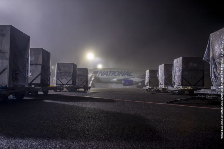 The first Amazon Leo satellites have landed in French Guiana, arriving from Florida and ready to begin the launch campaign of our very first Ariane 64 mission – the heavy-lift configuration of Ariane 6, powered by four P120C boosters.